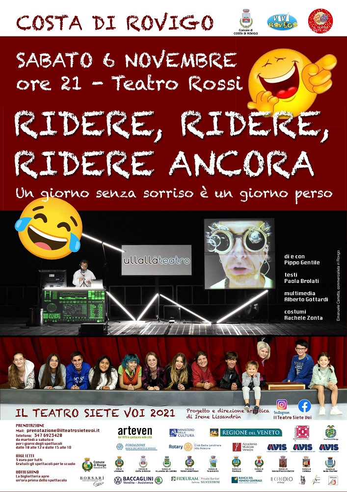 L’apertura ufficiale è sabato 6 novembre 2021, alle 21, al Teatro Rossi di Costa e porta in scena uno spettacolo dal titolo “Ridere, ridere, ridere ancora – Un giorno senza sorriso è un giorno perso” della strepitosa compagnia Ullallà Teatro di Marostica, già apprezzata la scorsa stagione nella rappresentazione scenica della fiaba “Rosaspina”. Ingresso tre euro con prenotazione obbligatoria, scrivendo a: prenotazione@ilteatrosietevoi.it; o via messaggio al 347/6923420. Green pass dai 12 anni. Il cartellone prosegue domenica 7 novembre a Villanova del Ghebbo e fino al 29 dicembre.