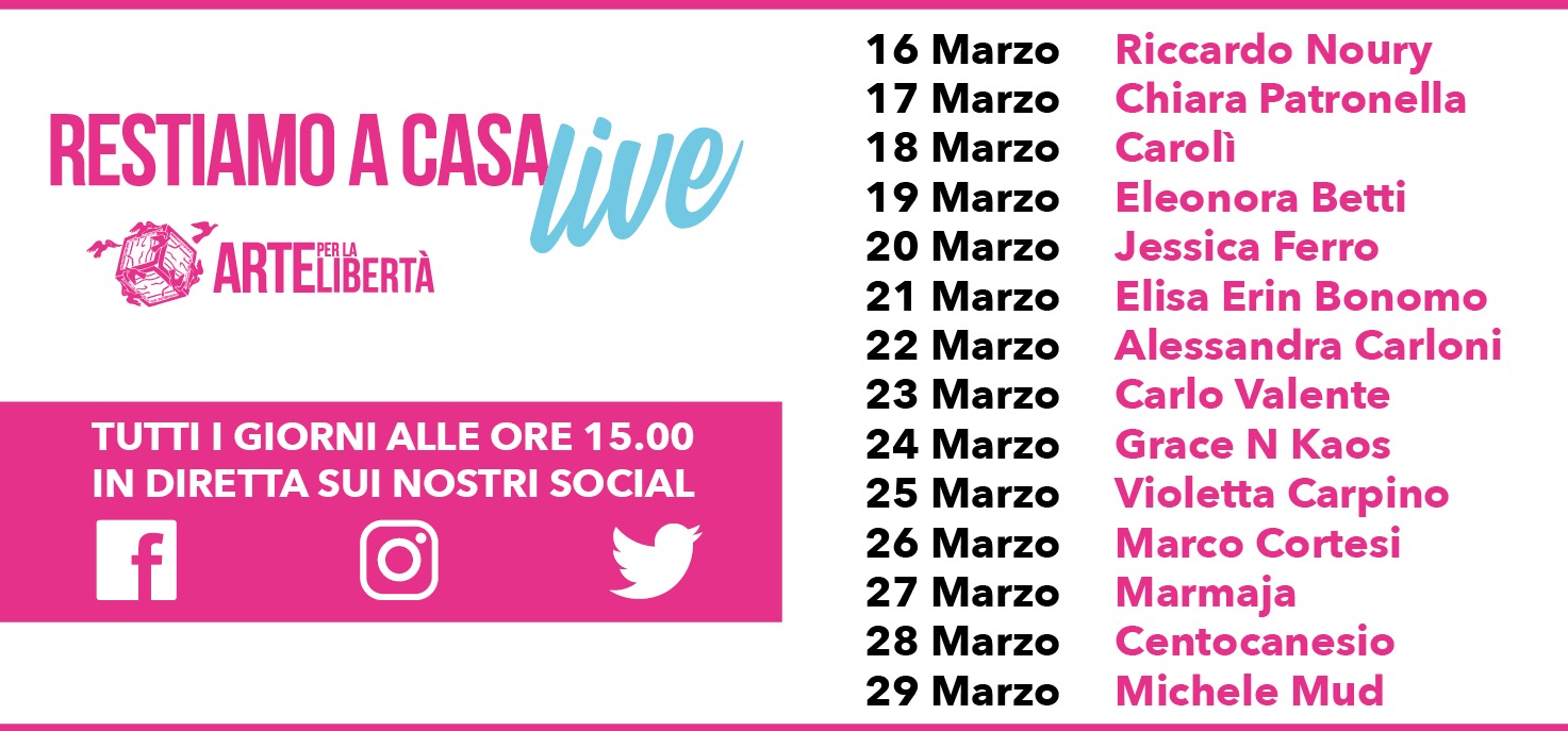“Restiamo a casa Live – Aspettando Arte per la Libertà” ha un calendario giornaliero che proporrà performance in diretta streaming sui social network legati al festival. Perché, come affermano Michele Lionello e Melania Ruggini, i due direttori artistici, “il nostro festival, e in più in generale la cultura del nostro Paese, non deve fermarsi proprio ora e deve innanzitutto cercare di regalare emozioni autentiche e momenti di spensieratezza a tutti.”
