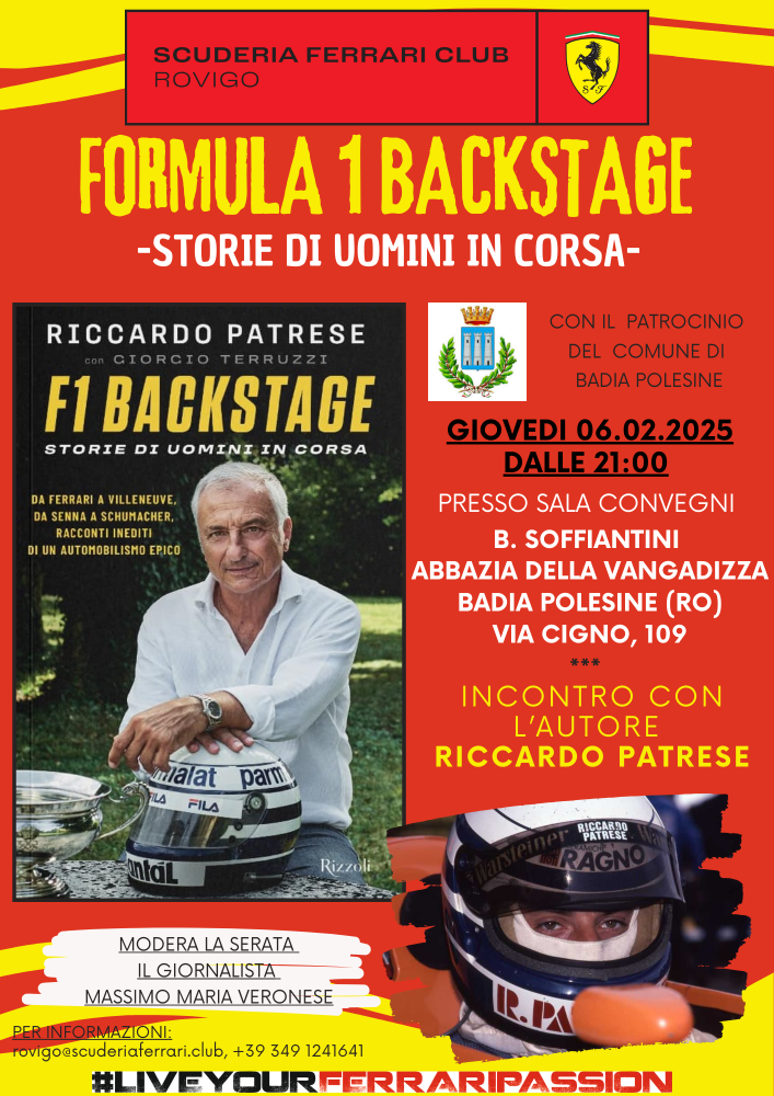 Badia Polesine (RO) – Giovedì 6 febbraio alle ore 21.00, nella splendida cornice della sala Soffiantini in Abbazia della Vangadizza, si terrà l’evento di presentazione del libro “F1 Backstage. Storia di uomini in corsa”, dell’ex pilota di F.1 Riccardo Patrese, ospite della Scuderia Ferrari Club di Rovigo, con il patrocinio del Comune di Badia Polesine.