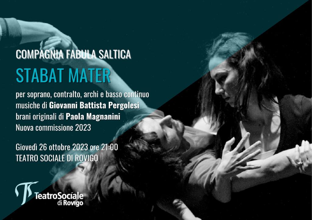 Lo Stabat Mater di Fabula Saltica nasce dalla collaborazione di Claudio Ronda, autore della coreografia e regista, col direttore d’orchestra Gerardo Felisatti, curatore della parte musicale, che in prima dirigerà l’Orchestra Filarmonia Veneta a cui si aggiungono alcuni elementi del Conservatorio Francesco Venezze di Rovigo. L’esecuzione è accompagnata da due voci straordinarie del panorama lirico italiano ed internazionale: la soprano Giulia Bolcato e la mezzosoprano Paola Gardina.