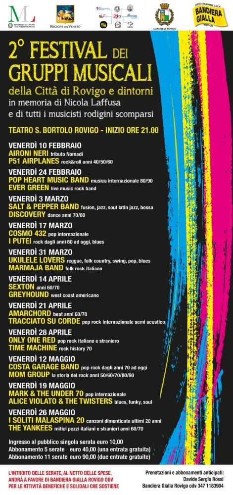 ROVIGO – Undici serate da febbraio a maggio, con 22 gruppi coinvolti. È il secondo Festival dei gruppi musicali città di Rovigo e dintorni, promosso dall’associazione Bandiera Gialla in collaborazione con il Comune di Rovigo. Un’importante manifestazione che coniuga musica e divertimento con la solidarietà.