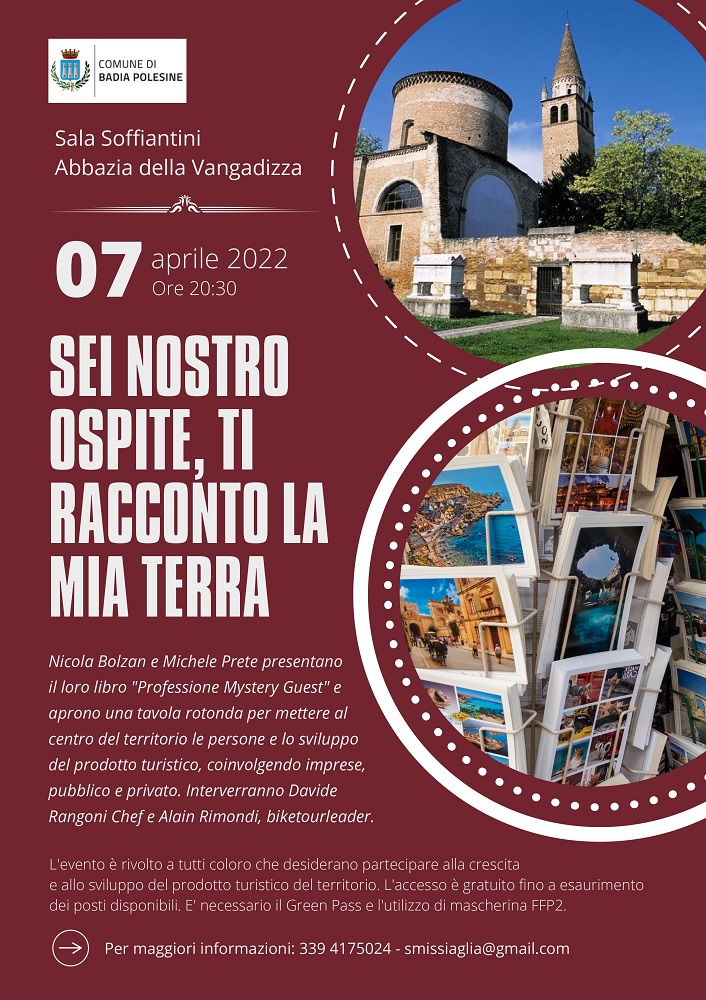 Badia Polesine (RO) – Giovedì 7 aprile alle ore 20.30, in Sala Soffiantini presso l’Abbazia della Vangadizza, si terrà l’iniziativa “SEI NOSTRO OSPITE, TI RACCONTO LA MIA TERRA”, incontro dedicato all’importanza della sinergia tra cultura e turismo, territorio, imprese e sostenibilità.