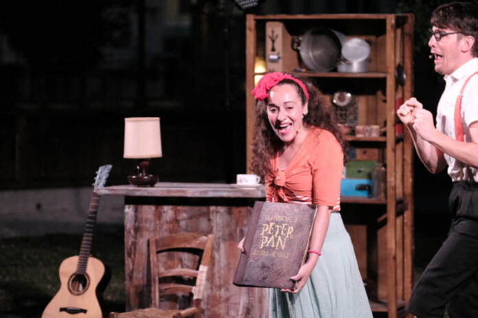 Nello scenario, già di per sé, immaginifico del parco comunale alberato di Bergantino, la compagnia Febo Teatro di Padova, ha allestito uno dei suoi spettacoli di punta, “Peter Pan”: trasposizione originale nella contemporaneità di quello che potrebbe essere un ipotetico prosieguo delle avventure originali scritte da James Matthew Barrie, in cui si scopre che un vecchio orso e arcigno, in realtà era proprio quel bambino che non voleva crescere. Semplicemente fantastici, divertenti, sopra le righe, come la loro storia, i tre attori in scena, Alice Centazzo, Massimiliano Mastroeni e Nicola Perin, che si sono divisi tra narrazione e teatro d’attore, uscendo e rientrando nei personaggi dell’iconografia classica: Wendy, Capitan Uncino, una Trilli solo suggerita con la fantasia, le battaglie tra pirati e bimbi-sperduti, a suon di mestoli e ammazzamosche. Un fiume di immaginazione a far vivere gli oggetti di scena, un cicaleccio di gag, faccette, risposte fuori copione ai bambini che lanciavano richiami e consigli dalle prime file e, tanta musica dal vivo, con la colonna sonora dei Beatles. Al termine dello spettacolo, pubblico scatenato nelle domande agli attori ed i piccoli spettatori hanno potuto sperimentare e provare gli oggetti di scena, come il mitico cappello verde di Peter Pan e – hai visto mai? – magari anche lui era in platea o nascosto tra gli alberi.