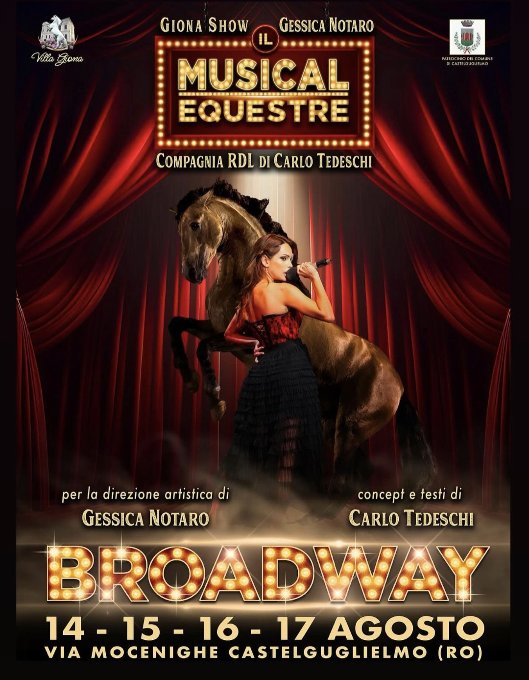 Castelguglielmo (RO) – Dal 14 al 17 agosto 2025, il Teatro Tenda di Villa Giona diventa il palcoscenico di un evento unico che unisce l’energia del musical alla spettacolarità dell’arte equestre. “Musical Equestre – Broadway”, diretto artisticamente da Gessica Notaro, porta in scena sessanta artisti e cinquanta cavalli di razze diverse per quattro serate consecutive, tutte con inizio alle 21.30.