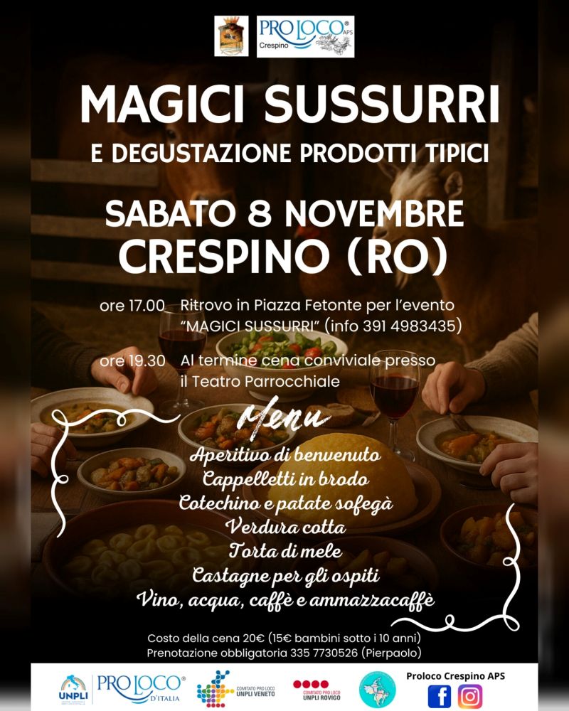 Crespino (RO) – Il fascino delle antiche credenze popolari rivive sabato 8 novembre, alle ore 17.00, al Museo delle Acque di Crespino, dove prenderà vita “Magici sussurri”, una rappresentazione teatrale con caccia al tesoro pensata per adulti e bambini. L’evento, inserito nel calendario della rassegna Veneto: Spettacoli di Mistero, trasformerà il piccolo borgo rivierasco in un palcoscenico incantato, dove storia, immaginazione e gusto si intrecceranno in un’esperienza fuori dal tempo.