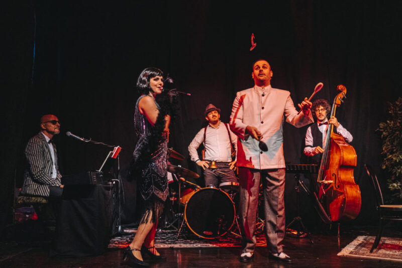 Musica dal vivo, atmosfere retrò e una comicità sottile e noir si fondono per restituire il gusto degli Anni Ruggenti: l’epoca di Al Capone e delle sparatorie tra bande rivali, ma anche del charleston, dei cappellini a cloche, delle prime donne indipendenti e degli speakeasy fumosi, dove si ballava al ritmo dell’old jazz.