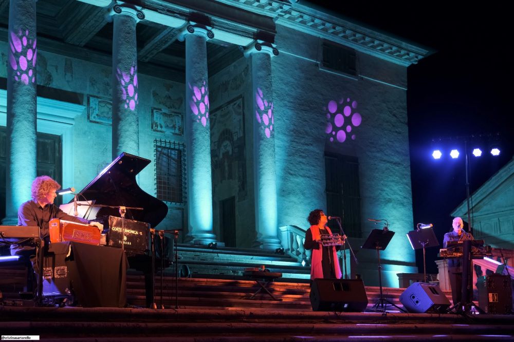 Spettacolo nel concerto, la scenografia luminosa diretta da Gianluca Quaglio, proiettata sulla facciata della palladiana Badoera. Muri, scalinate e colonne sembravano vivi, come ritagliati da colori vibranti di un’intelligenza artificiale. Quadri blu, verdi e rossi; disegni e illusioni ottiche, come se d’un tratto il marmo si trasformasse in legno e, poi in metallo rovente. Ottimo l’impianto fonico di Carlo service, che è ormai un marchio di fabbrica per Tra ville e giardini.