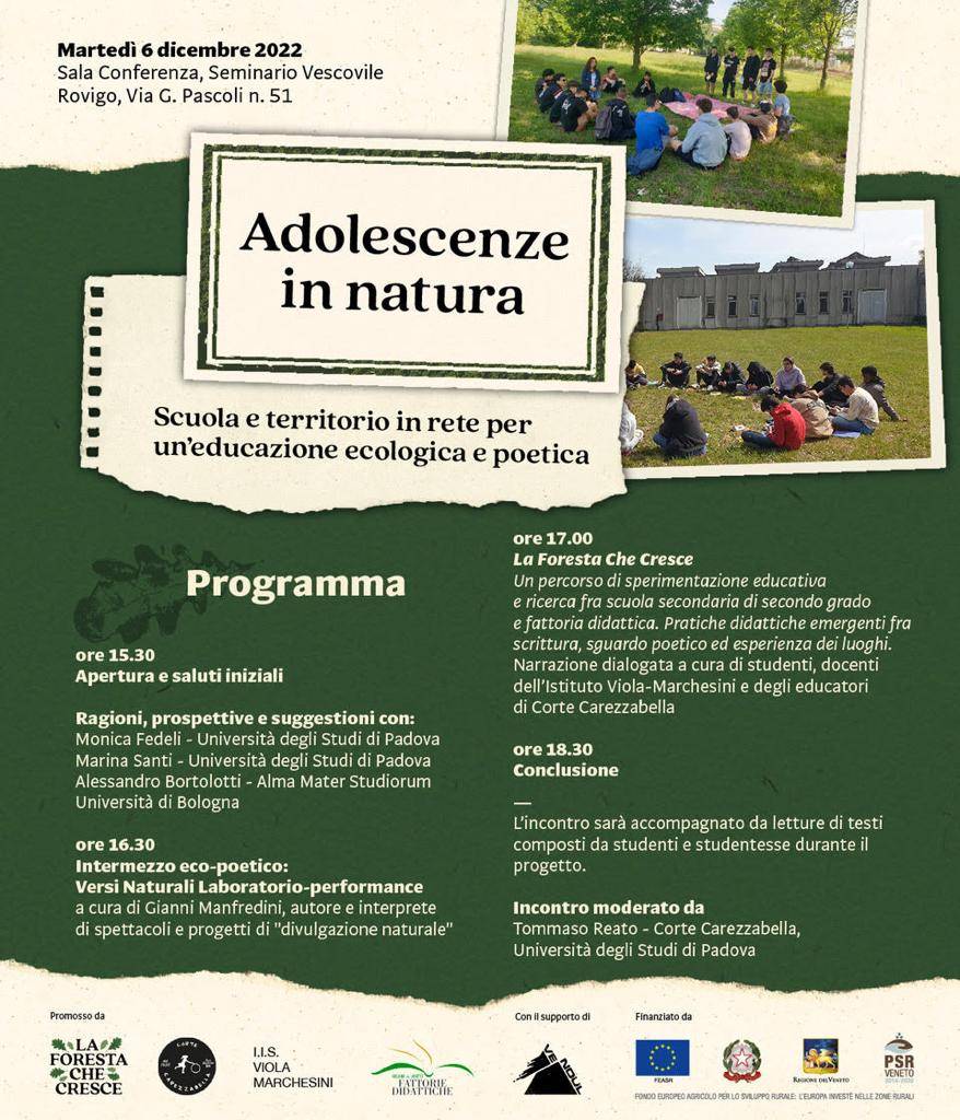 ROVIGO – Si intitola “Adolescenti in Natura. Scuola e territorio in rete per un’educazione ecologica e poetica” l’incontro in programma per martedì 6 dicembre, presso la Sala Conferenze del Seminario Vescovile, in via Pascoli 51 a Rovigo.