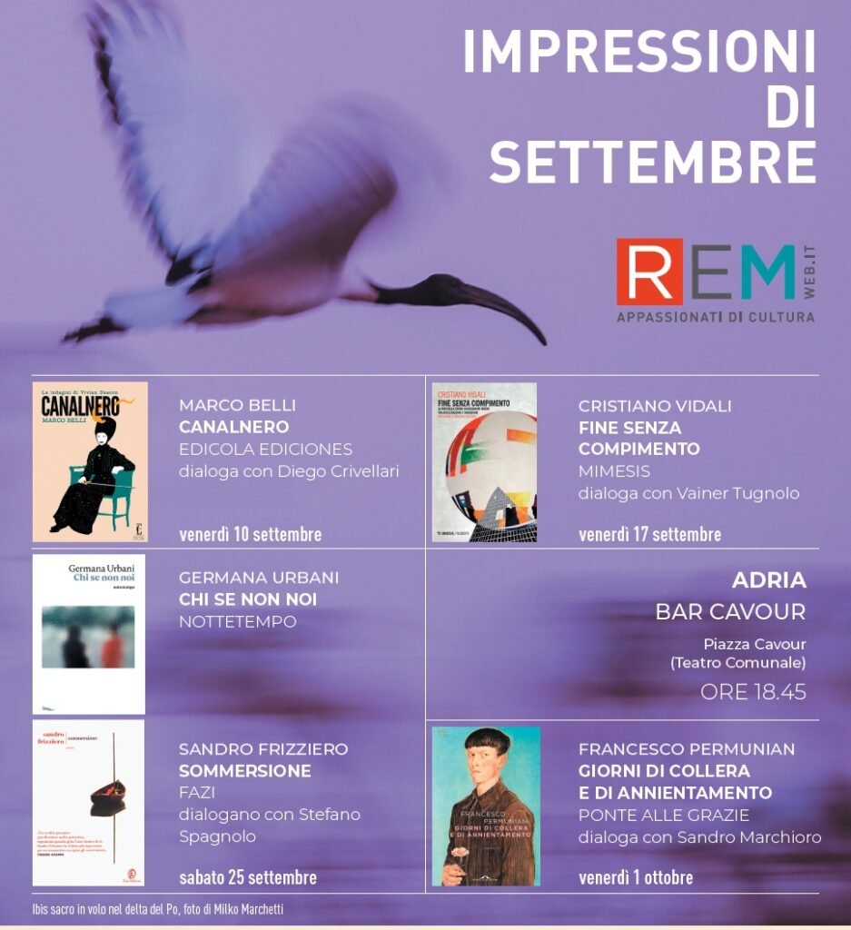 Chiuderà la rassegna, venerdì 1° ottobre, Francesco Permunian con il suo nuovo libro, in uscita il 16 settembre, “Giorni di collera e di annientamento” (ed. Ponte alle Grazie). Lo scrittore dialogherà con Sandro Marchioro, direttore della rivista REM il cui ultimo numero è pronto per uscire a metà settembre e verrà presentato in alcune tappe di “Impressioni di settembre”.
