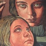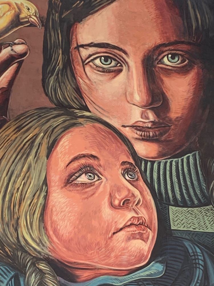 Nell’opera campeggiano due figure femminili, incassate in uno spazio angusto. Al centro una giovane donna con uno specchio in mano e lo sguardo titubante diretto all’osservatore. In primo piano una bambina con una vecchia sciarpa intenta a osservare lo specchio e i suoi riflessi. In alto un canarino posato sulle dita della donna, anch’esso incuriosito dallo specchio, in basso una mela e un biglietto, fra le mani della bambina.