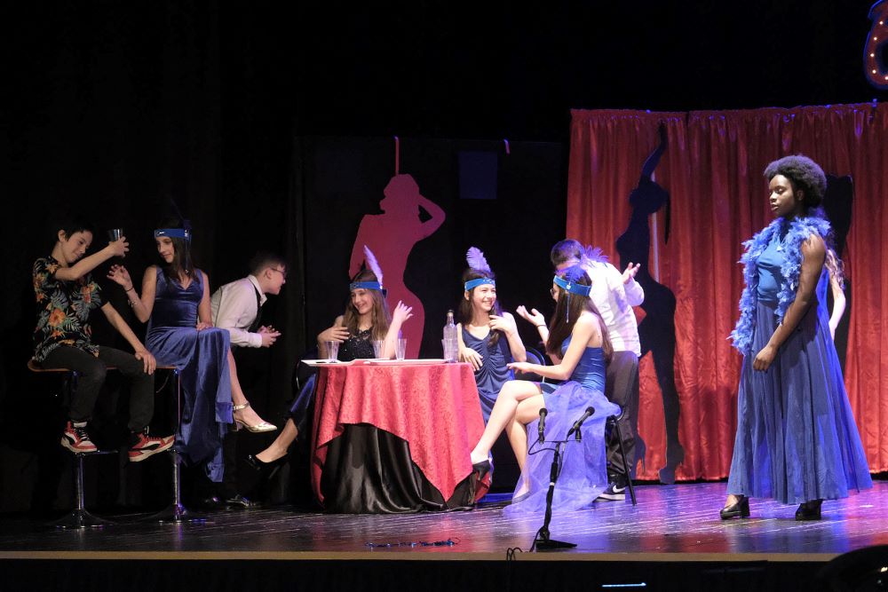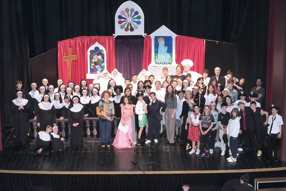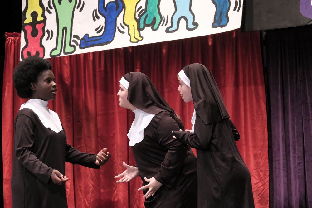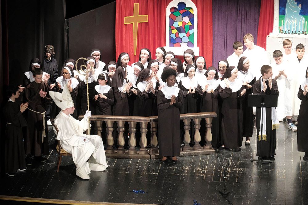 La coralità ed il grande affiatamento emerge subito, fin dall’apertura del sipario. Attori e comparse hanno tutti la stessa importanza e si muovono coordinati in un grande meccanismo, dove niente è fermo. Ottime le scene di gruppo. Non a caso, le insegnanti dicono degli allievi che “sono abituati a pensarsi dentro un’orchestra”. E l’orchestra, di 30 elementi, c’è davvero e riempie l’aria di vibrazioni positive, oltre a consentire gli importanti e continui cambi di scena e le coreografie. Un plus valore di questo spettacolo. Davvero apprezzabili le scenografie, che mutano ad ogni scena, con un ottimo lavoro sincrono degli assistenti di palco: la ricostruzione del night Blue moon dove lavora la cantante Deloris Van Cartier, del convento di Santa Caterina dove Deloris si nasconde sotto le vesti di Suor Maria Claretta per sfuggire ai tirapiedi del boss Vince La Rocca, della cattedrale dove si esibisce il coro delle suore, dei locali notturni in cui Deloris fa una sortita per insofferenza alla vita monastica, che sono poi testimoni di numeri acrobatici hip hop, balli Boogie woogie e perfino di un divertente spogliarello di poliziotti in stile Full monty. Simpatici e bravi i cori degli angeli insieme alla coreografia con le ali luminose. Evocative le “suore fluttuanti” della “buona notte”, di bianco vestite e munite di lumino, che disegnano girandole e linee caleidoscopiche. Un buon lavoro, molto articolato, difficile da organizzare, in cui spiccano la componente home made e artistica di balletti, costumi, e scenografie. Ormai iconici i cori delle suore, fedeli all’originale, che esplodono nel brano gospel finale “I will follow Him”.