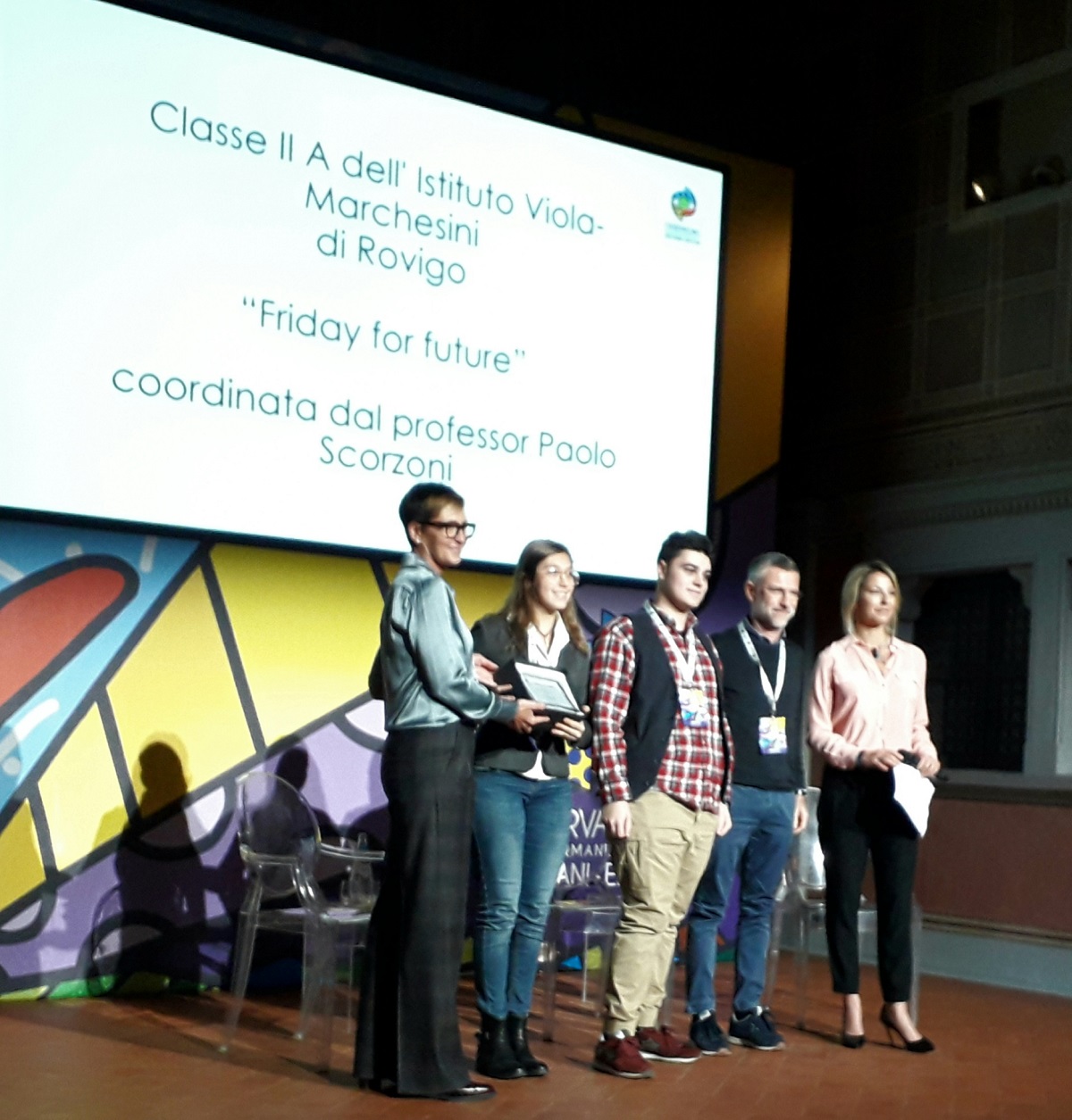 A salire sul podio è stata la classe IIIA dell’Itis Viola-Marchesini di Rovigo, coordinata dal suo docente di Lettere, prof. Paolo Scorzoni. Tante le motivazioni della giuria di esperti per assegnare il premio alla classe di Rovigo che ha scelto di aderire al concorso con un tg tematico sul tema ambientale. Gli studenti hanno realizzato un video di tre minuti, sotto forma di Tg, chiamato “Ultima Ora”. Divisi in due gruppi, hanno immaginato, due situazioni ambientate nel 2039, a vent’anni dalle manifestazioni del “Friday’s for future”.