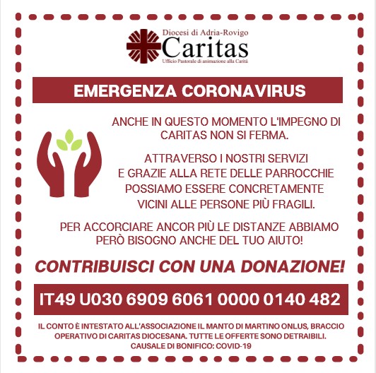 Il conto è intestato all’Associazione Il Manto di Martino Onlus, braccio operativo della Caritas diocesana di Adria-Rovigo.