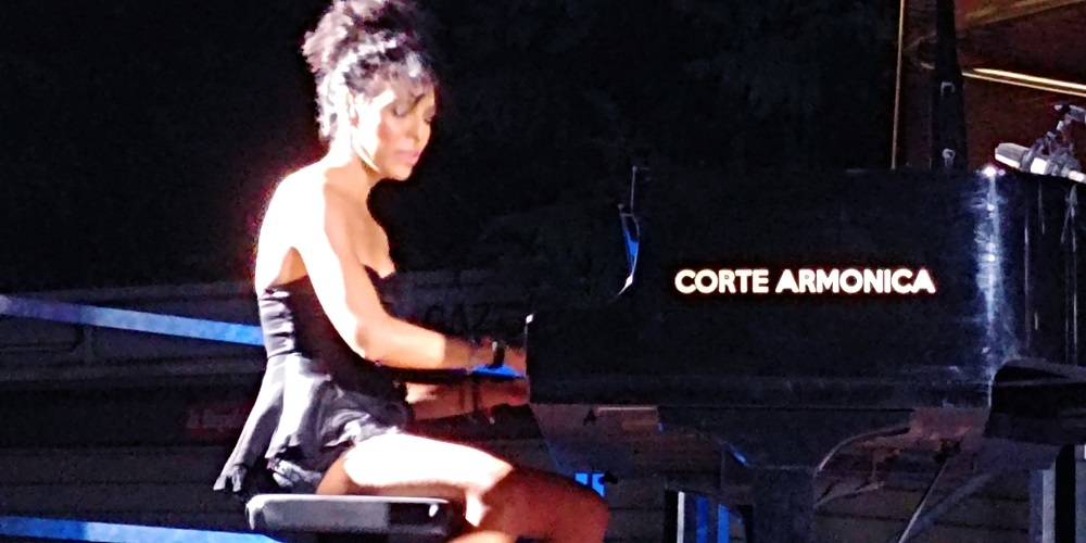 Tanti ringraziamenti, di tutt’altro genere, sono venuti dal palco, dalla straordinaria Marialy Pacheco, nella sua esuberante parlata spagnola, che con visibile gratitudine, lei che è un’artista di fama internazionale, ha sottolineato l’importanza di questo evento concertistico per chi vive di musica; senza musica il musicista è come un elettrodomestico con la spina staccata. Ha ricordato che era appena al suo secondo live dopo lo stop pandemico e si è messa al pianoforte con tutta l’intensità, la scorrevolezza, la delicatezza dei suoni ritmati che le arrivano dalle contaminazioni sonore della culla cubana e che lei rimescola su una base jazz.