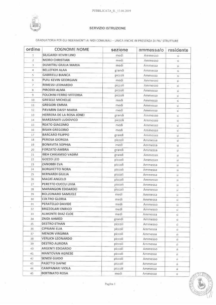 Le Famiglie dei bambini ammessi verranno contattate nei prossimi giorni per l’accettazione del posto nido.