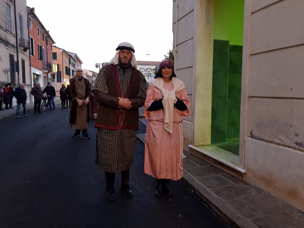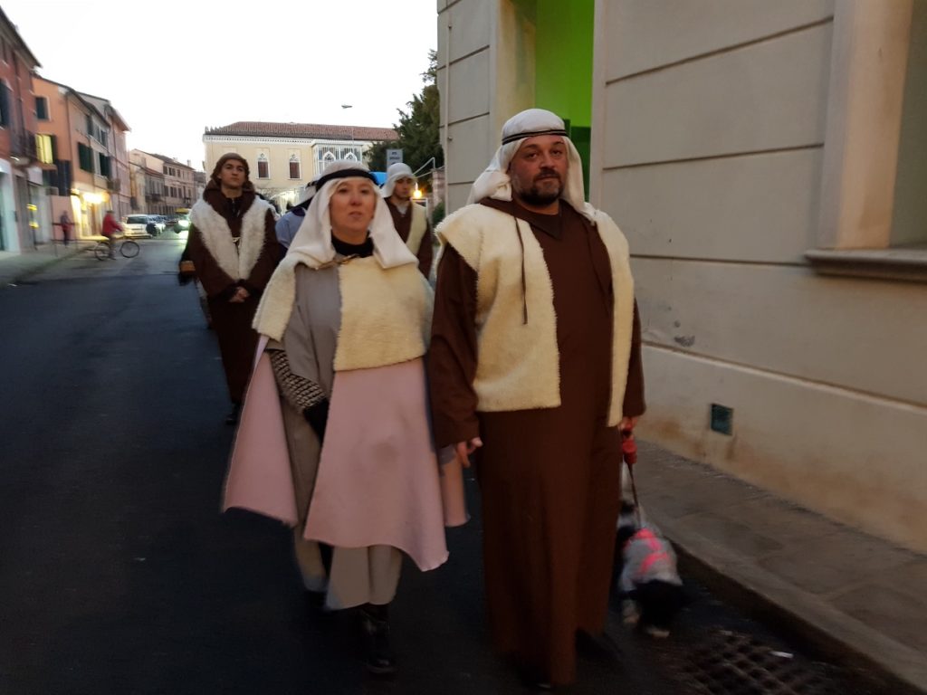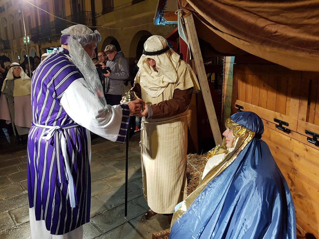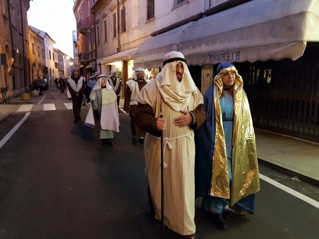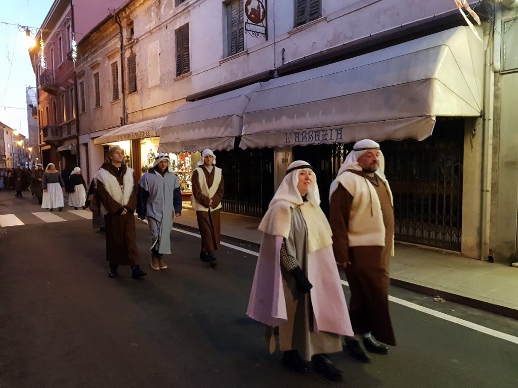 Oltre 40 i figuranti, tra quelli che hanno sfilato in corteo partendo da Piazza Vangadizza e quelli presenti lungo il tragitto nelle diverse postazioni in rappresentanza degli antichi mestieri. Il tutto accompagnato dalla diffusione di musiche della tradizione natalizia, dal suono di zampogne e ciaramelle, dalla lettura della celebre “Notte Santa” del poeta Guido Gozzano e di alcuni versetti tratti dal Vangelo.