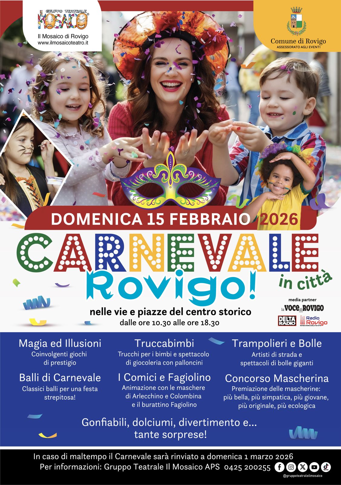ROVIGO – Coriandoli, stelle filanti e tanta voglia di divertirsi: domenica 15 febbraio il Carnevale in città animerà il centro storico di Rovigo trasformandolo in un grande palcoscenico all’aria aperta. Dalle 10.30 alle 18.30, le due piazze principali e Corso del Popolo ospiteranno spettacoli, giochi e attrazioni pensate per coinvolgere grandi e piccini in una giornata all’insegna della festa.