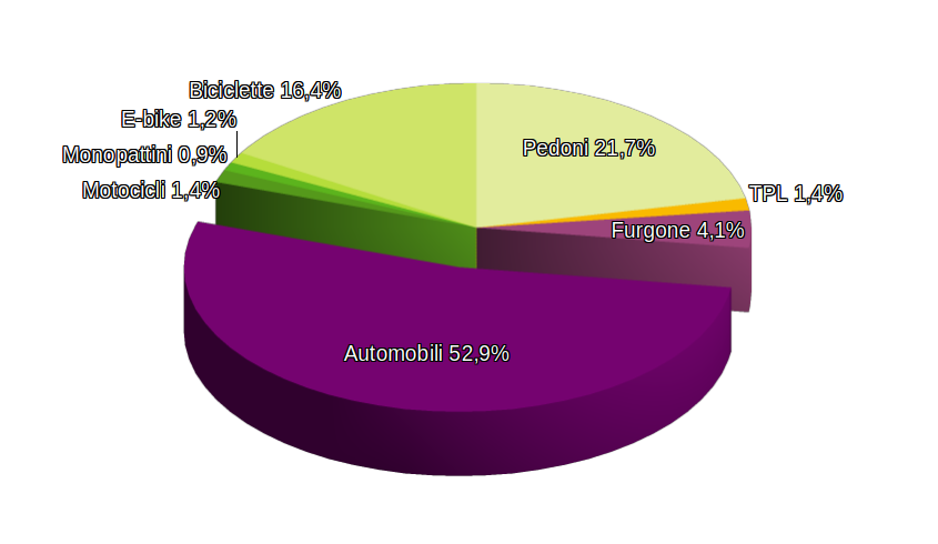 Il dato che emerge è netto e non lascia dubbi: sul Corso del Popolo il mezzo di trasporto preferito è l’auto privata. Questo mezzo rappresenta ben il 52,9% dei modi rilevati. Al secondo posto troviamo chi si sposta a piedi pari al 21,7% (primo anno che si misura anche questa modalità di spostamento; la rilevazione ha riguardato solo gli attraversamenti del Corso del Popolo) e al terzo posto le biciclette con un 17,6 % (di cui un 1,2% rappresentato da e-bike). Residuali altri mezzi di locomozione (furgoni 4,1%, motocicli e TPL 1,4 % e monopattini 0,9 %).
