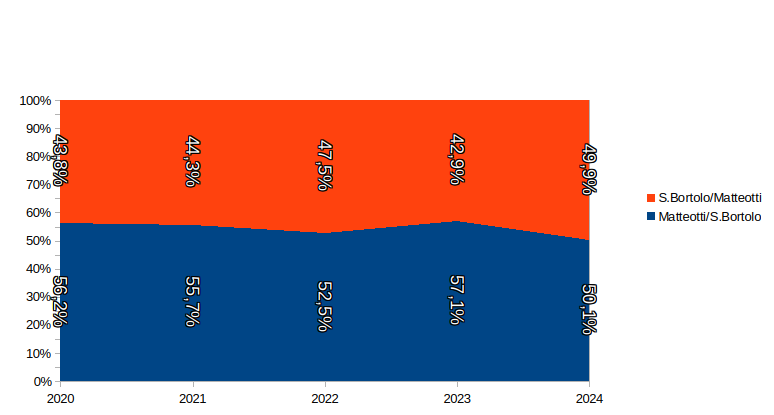 Stando sui mezzi a motore, maggioritari, emerge come la direttrice maggiormente “battuta”, seppur di poco, sia quella che va da Piazza Matteotti verso il quartiere San Bortolo con il 50,1% degli spostamenti. Una conferma rispetto ai dati degli scorsi anni sebbene molto meno marcata.