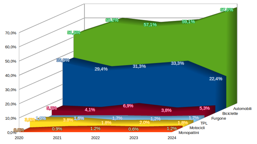 In un confronto esclusivo tra i mezzi di trasporto, il dato più eclatante dell’indagine 2024 è il balzo di ben 8,5 punti percentuali delle automobili in transito. Un dato che vede un crollo di oltre 10 punti percentuali delle biciclette. Un calo importante, pur restando il secondo mezzo di trasporto preferito dai rodigini.