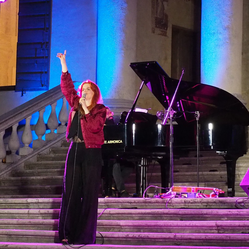 Fra gli applausi a scena aperta è scesa sulla scenografica scalinata palladiana, Chiara Galiazzo sulle note malinconiche acustiche di “Honolulu”, singolo tratto da “Bonsai” (2020, Sony music), l’ultimo album che ha costituito il cuore del concerto. Subito è rimbalzata verso il pubblico quella voce fresca, cristallina, limpida e pulita, ma potente, un timbro chiaro, argentino, ma con mille sfumature di colore intenso ed una vocalità molto estesa, con sapienti vibrati e moderni saliscendi. È un piacere ascoltarla e rapisce l’udito, che quasi non si sentono le parole. Ma il fraseggio è nitido ed i testi rimandano ad esperienze emozionali, a sensazioni autobiografiche, ad intensi pensieri. È un po’ il mood dell’ultima Chiara, in cerca del “suo posto nel mondo”. Ma siamo già anni luce dagli esordi: qui c’è una cantante solida e credibile. Puntatina verso i grandi successi: la sanremese “Il futuro che sarà” ed il disco di platino Fimi “Due respiri”; poi si ritorna al presente con “Pioggia viola” e “Kamikaze”. Intensissimo “Bambola Daruma” cantato e suonato in solitaria al pianoforte.