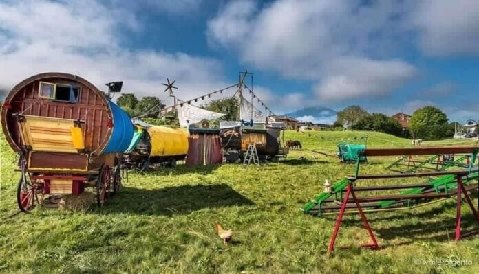 Si tratta di un minuscolo circo che si sposta con carovane a botte trainate da cavalli e con gli artisti che lo seguono in bicicletta.