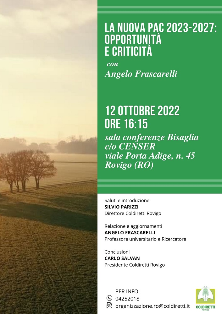 L’incontro vedrà la partecipazione di Angelo Frascarelli, professore associato dell’Università di Perugia al Dipartimento di Scienze agrarie, alimentari ed ambientali, presidente di Ismea, tra i massimi esperti di Pac in Italia, il quale illustrerà il percorso e i cambiamenti rispetto all’attuale programmazione.