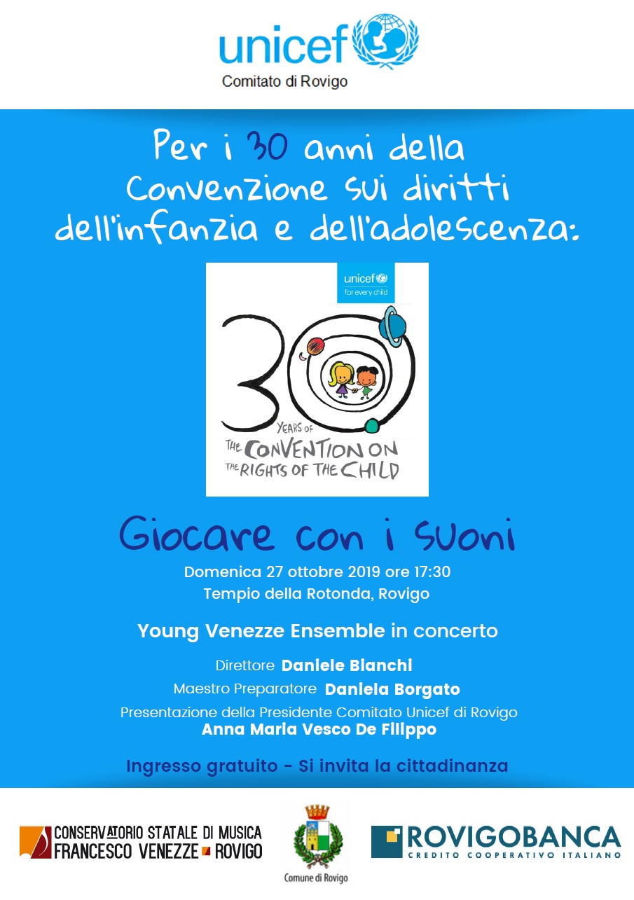 L’Unicef di Rovigo festeggia i 30 anni della Convenzione sui diritti dei bambini, con un concerto in Rotonda. L’evento si terrà in collaborazione con il Conservatorio “Venezze”, domenica 27 ottobre alle ore 17,30 con l’orchestra “Young Venezze Ensemble”. L’esibizione diretta da Daniele Bianchi, con maestro preparatore Daniela Borgato, avrà come titolo “Giocare con i suoni”.