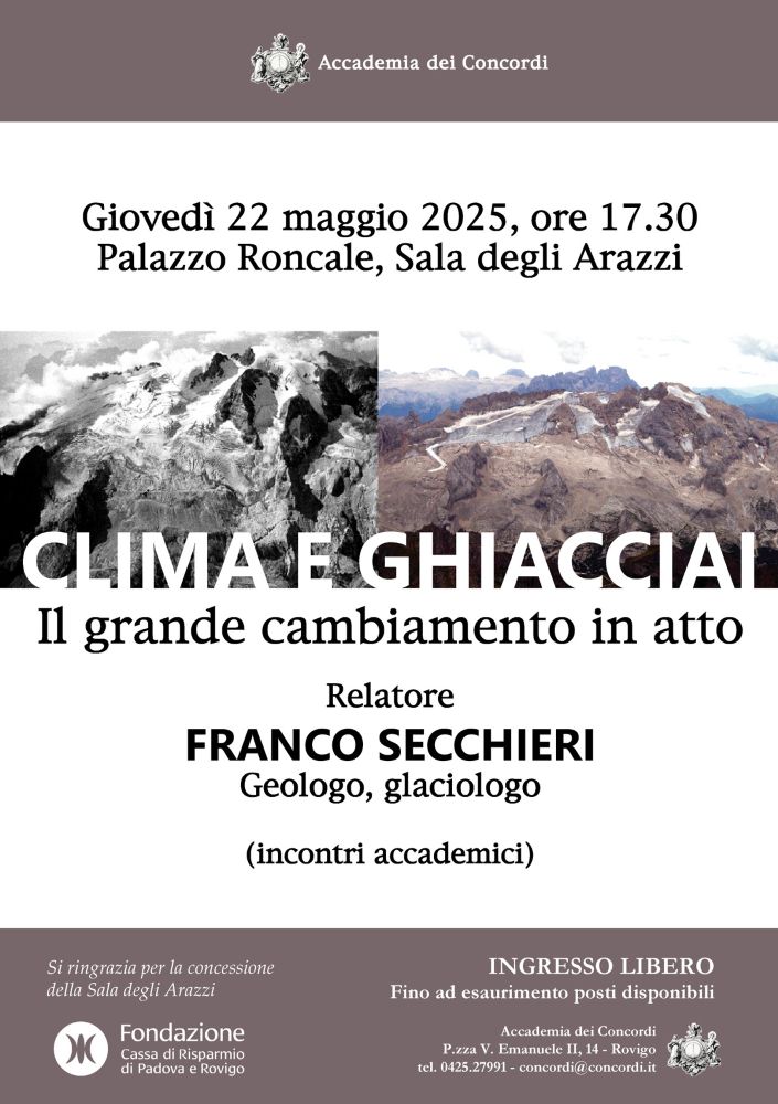 Per approfondire il tema, giovedì 22 maggio alle ore 17:30 presso Palazzo Roncale, Sala Arazzi, il geologo e glaciologo Franco Secchieri illustrerà lo stato dei ghiacciai alpini attraverso analisi scientifiche e documentazione fotografica, tracciando un quadro della situazione attuale e delle prospettive future.