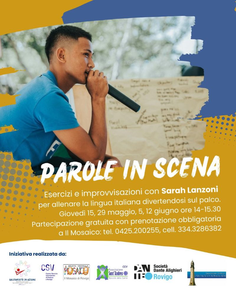 Il programma del laboratorio, condotto da Sarah Lanzoni, prevede esercizi e improvvisazioni teatrali per allenare la lingua italiana sul palco. Gli incontri si svolgeranno il 15 e 29 maggio, e il 5 e 12 giugno dalle 14 alle 15.30, a Rovigo, nella Locanda della Casa, in via Giovanni Pascoli 51. Info e prenotazioni: Il Mosaico – 0425.200255 – 334.3286382 (ancora posti disponibili).
