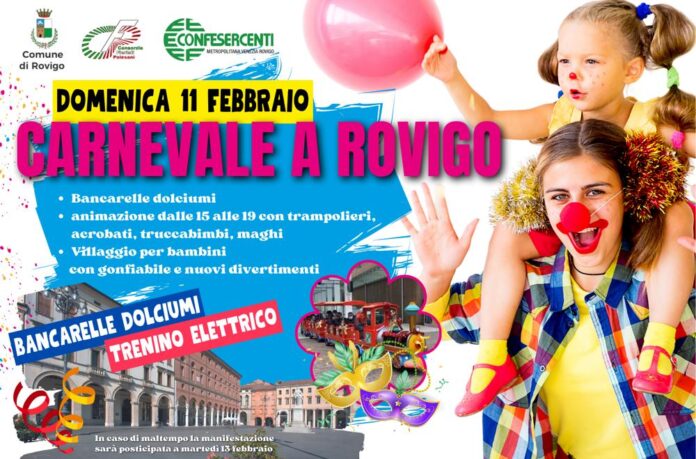ROVIGO – La città domenica 11 febbraio festeggia il Carnevale. Piazza Vittorio Emanuele II e il centro cittadino si riempiranno di allegria e tanto divertimento.