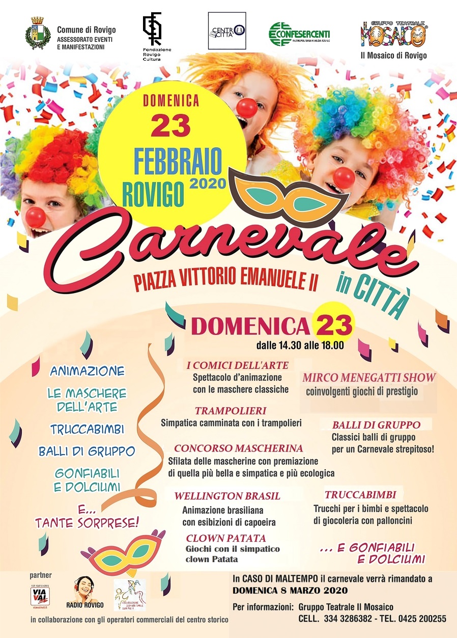 ROVIGO – Il “Carnevale in città 2020” si terrà nel pomeriggio di domenica 23 febbraio – dalle 14.30 alle 18.00 – in Piazza Vittorio Emanuele II. La manifestazione è organizzata dal Gruppo Teatrale “Il Mosaico”, in collaborazione con il Comune di Rovigo Assessorato agli Eventi e Manifestazioni, Fondazione Rovigo Cultura, Associazione Centro Città Rovigo, Confesercenti Metropolitana Venezia Rovigo.