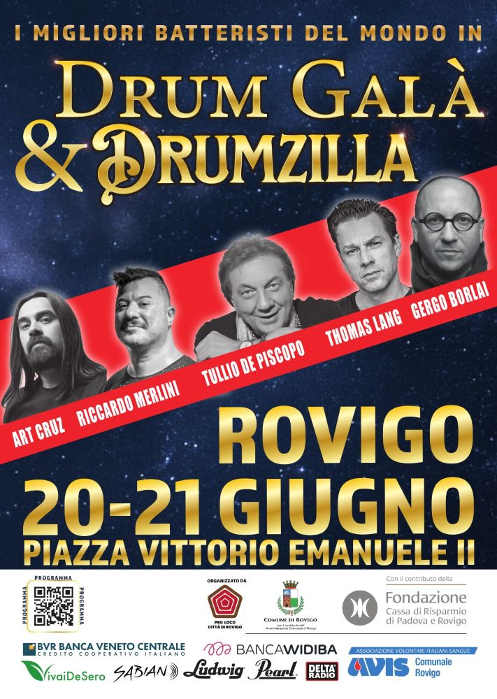 Il Drum Galà, come ha sottolineato l’organizzatore Claudio Lupo, insieme al partner Marco Bressanin, presidente di Pro Loco Città di Rovigo, si conferma non solo come evento spettacolare, ma anche come momento formativo grazie alla collaborazione con il Drumzilla Camp by Riccardo Merlini, che dal 20 al 22 giugno accoglierà batteristi da tutta Europa per sessioni intensive all’Hotel Palace di Rovigo.