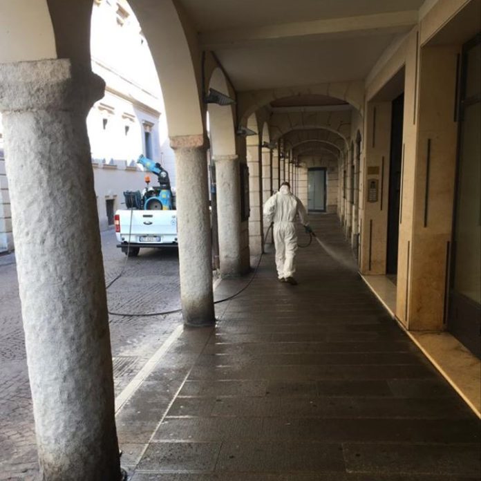 ROVIGO – È partita la sanificazione degli spazi aperti. In questi giorni, sia in città che nelle frazioni, una ditta specializzata sta effettuando gli interventi di sanificazione delle aree aperte. L’iniziativa è realizzata dal Comune in collaborazione con la Provincia di Rovigo. In particolare, come spiega l’assessore all’Ambiente Dina Merlo, l’intervento coinvolgerà le zone maggiormente frequentate in ambito urbano, come portici, marciapiedi, piazze, accessi ad edifici di uso pubblico. Vengono sottoposti a sanificazione gli arredi urbani, le pensiline, le panchine ad uso pubblico che si trovano nelle aree ove maggiore è la presenza e il contatto diretto dei cittadini.