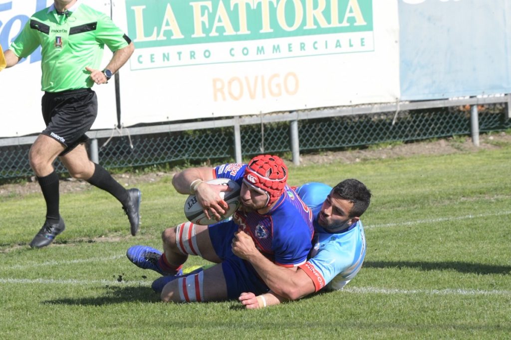 Il Rovigo parte forte andando subito nei 22 avversari, dove però commette troppi falli facendo così risalire il campo al San Donà. Dopo una mischia sui 5 metri rossoblù Owen schiaccia l’ovale oltre la linea, marcando così i primi cinque punti della partita al 7’. Lyle non trasforma. I rossoblù non si fanno intimorire e con un break dopo la metà campo avversaria Cioffi vola in meta, Chillon centra i pali per il 7-5. Al 22’ i biancocelesti, agguerriti, dopo aver ottenuto un calcio a favore per un altro fallo del Rovigo, optano per i pali che Lyle centra per 7-8. I rossoblù risalgono il campo dopo aver ottenuto un calcio a favore, poi avendo aperto il gioco Chillon trova un varco nella difesa del San Donà e va a segnare la seconda meta di giornata; lo stesso non centra però i pali per la trasformazione: 12-8. Pochi minuti dopo i biancocelesti per l’indisciplina del Rovigo ottengono un altro calcio a favore, che Lyle mette tra i pali per il 12-11. Alla fine del primo tempo le squadre tornano agli spogliatoi sul risultato parziale di 12-11.