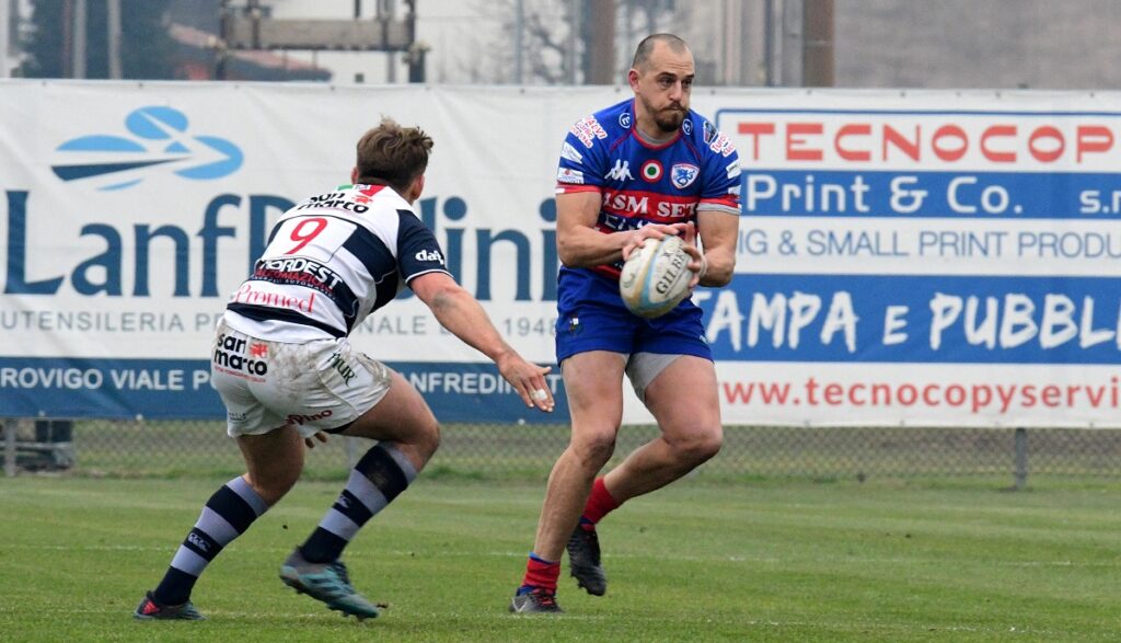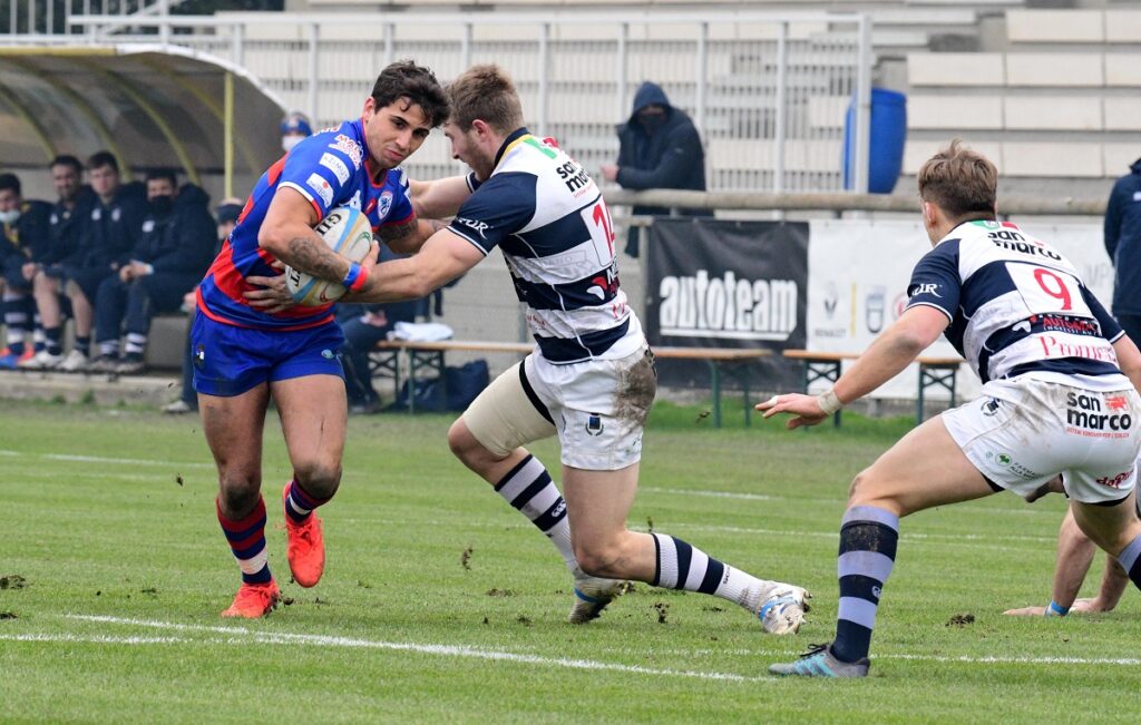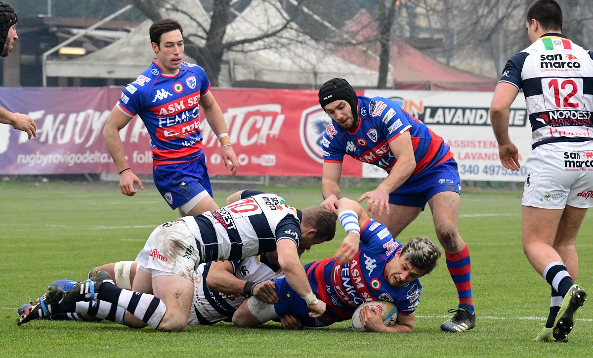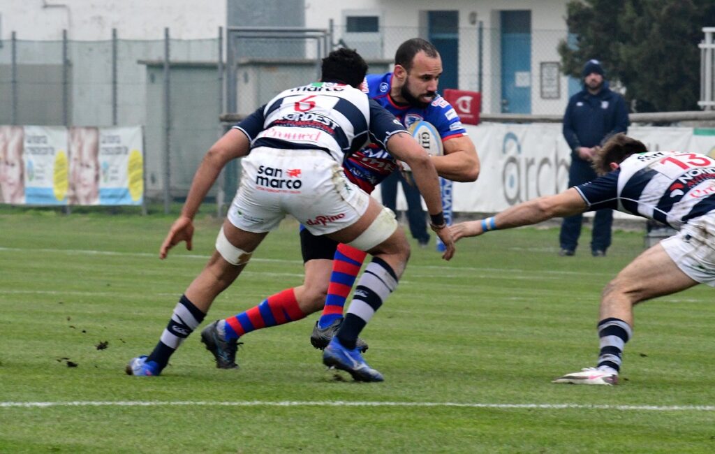 ROVIGO – Una giornata nuvolosa accoglie le due formazioni al Battaglini di Rovigo; squadre in fase di studio nei primi quindici minuti di gioco con nessuna azione in evidenza tranne un drop sbagliato di Ormson. Il tabellone viene sbloccato al 15’ con un calcio piazzato di Menniti-Ippolito che va a fissare i primi tre punti, 3-0. Al 21’ il Mogliano Rugby risponde dalla piazzola e Ormson, da posizione favorevole, centra i pali, 3-3. Al 31’ i biancoblù ottengono un calcio a favore e Ormson aggiungere altre tre punti per gli avversari, 3-6. Al 39’ i rossoblù fissano altri tre punti dalla piazzola con Menniti-Ippolito, 6-6. Al termine del primo tempo i rossoblù trovano la prima marcatura con Uncini che con un ottimo break personale, dopo gli avanzamenti di Modena e Cioffi, vola in meta, Menniti-Ippolito trasforma e manda così le squadre negli spogliatoi, 13-6.