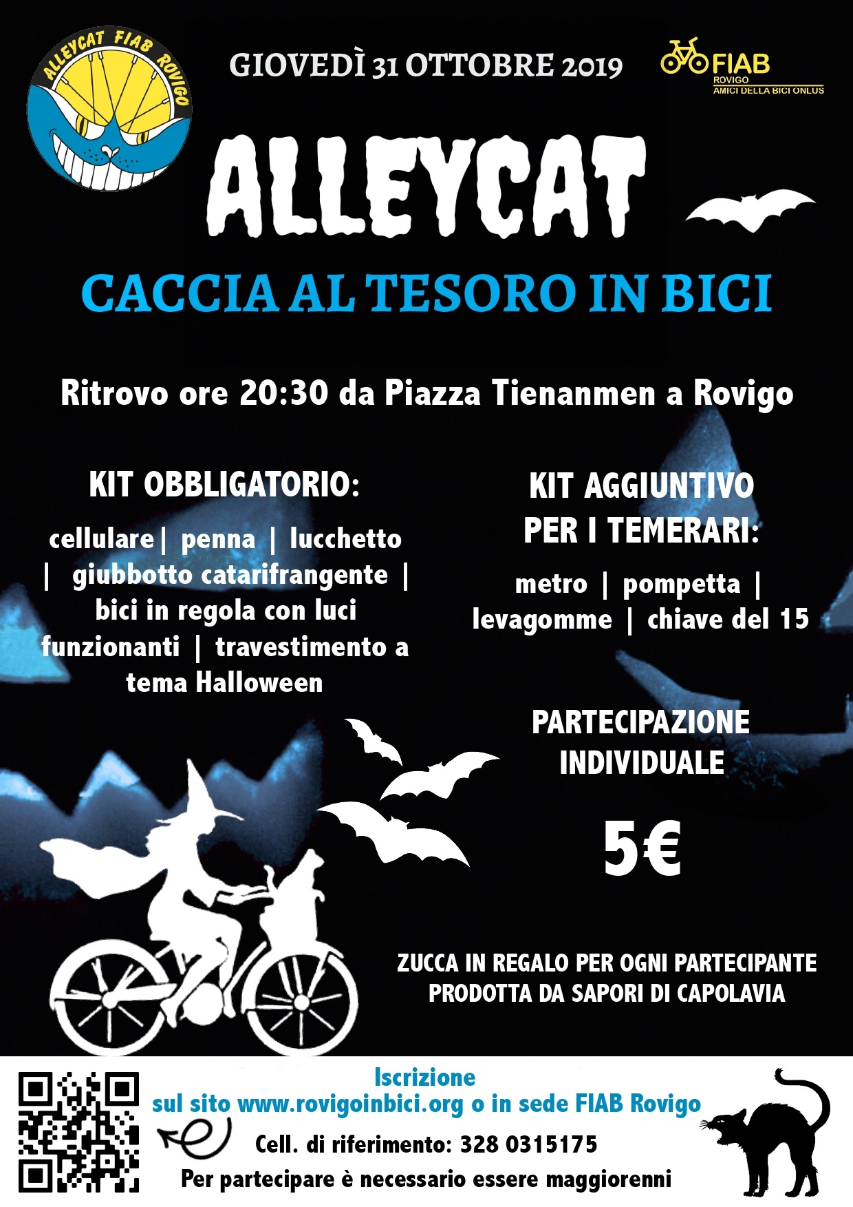 L’iniziativa si ispira alle Alleycat delle grandi città, una corsa nata esattamente trent’anni fa a Toronto e che negli anni si è diffusa in tutto il mondo, diversa ogni volta perché non esiste una regola standard. Originariamente dedicata ai ciclofattorini che simulavano, in modo goliardico, una loro tipica giornata di lavoro, la Alleycat race (tradotta significa la corsa dei gatti randagi) è stata così reinterpretata da FIAB Rovigo per animare la notte di Halloween e per raccontare in un modo diverso la bicicletta e la città assecondando le finalità delle iniziative FIAB di promuovere la mobilità sostenibile.