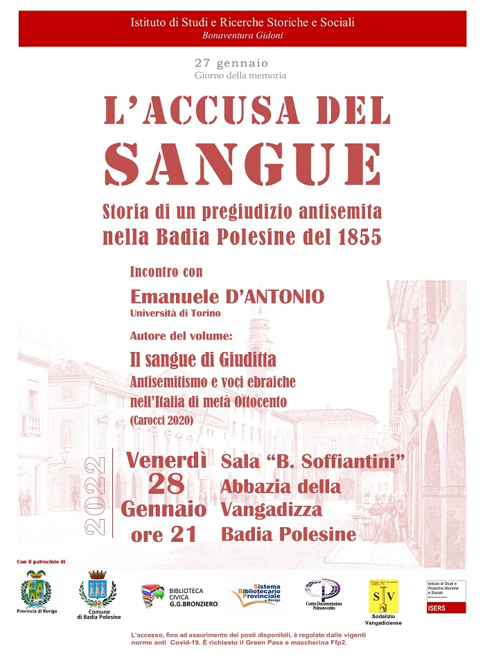 Badia Polesine (RO) – In occasione del Giorno della Memoria 2022, in ricordo delle vittime della Shoah, venerdì 28 gennaio – alle ore 21.00 – presso la sala convegni “B. Soffiantini” in Abbazia della Vangadizza, si terrà la conferenza dal titolo: “L’accusa del sangue. Storia di un pregiudizio antisemita nella Badia Polesine del 1855“.