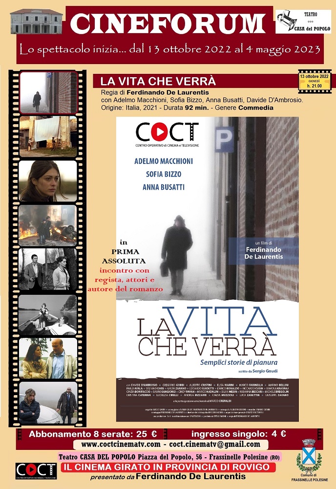 In coincidenza con la prima proiezione del film, il 13 ottobre, oltre ad essere la lezione di apertura dell’Università popolare di Frassinelle, sarà anche l’occasione per presentare l’uscita ufficiale del libro “La vita che verrà” di Sergio Gnudi, da cui è stato tratto l’adattamento. Il film fu girato in buona parte tra il 2019 e il 2020, prima del lockdown, ma poi ultimato nel 2022 e prodotto dal Coct, che a Frassinelle gestisce l’Accademia di cinema e radiotelevisione.