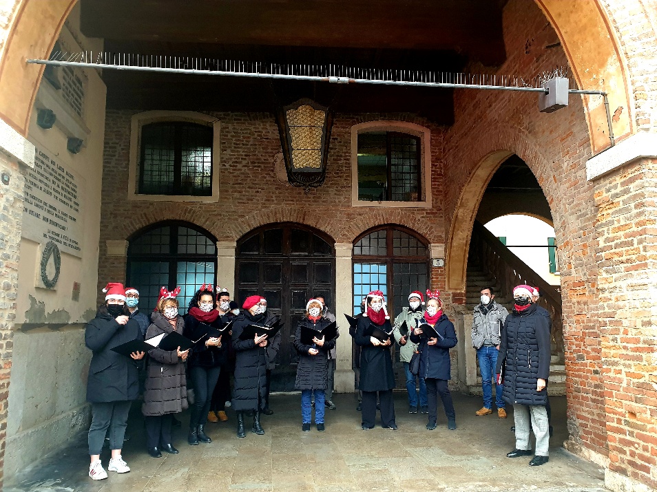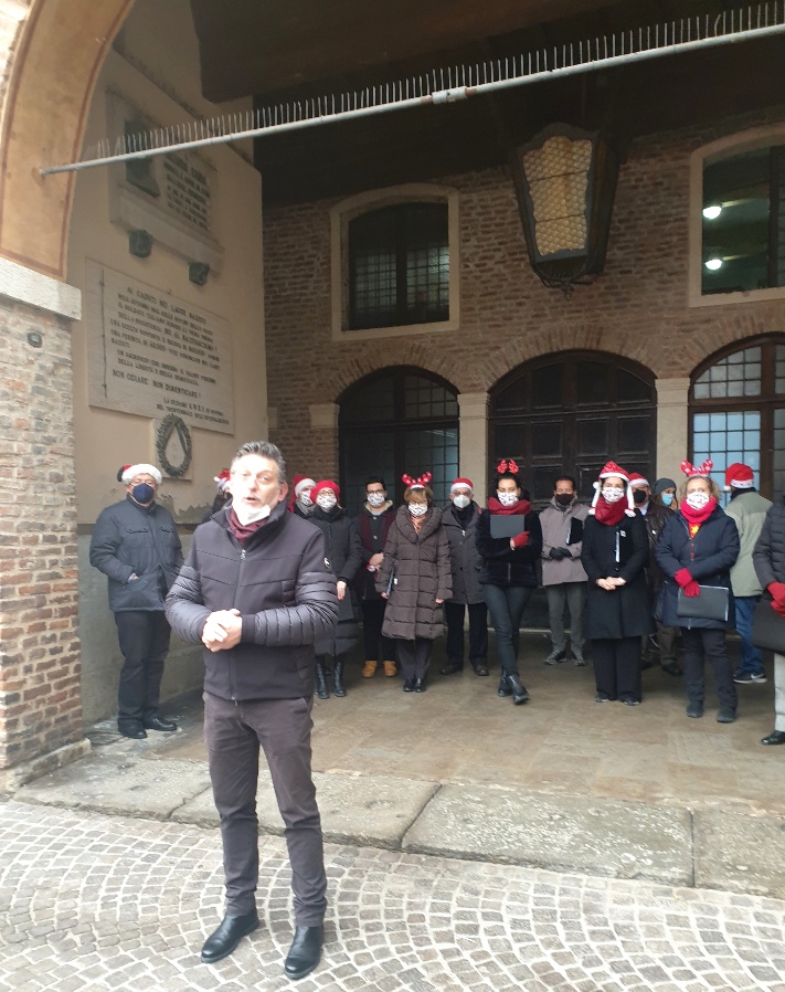 Gli auguri ai dipendenti di palazzo Nodari, in piazza all’aperto con il coro Venezze Consort