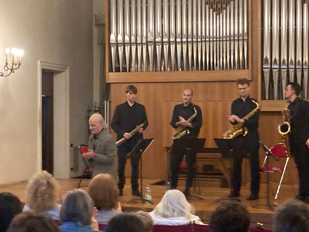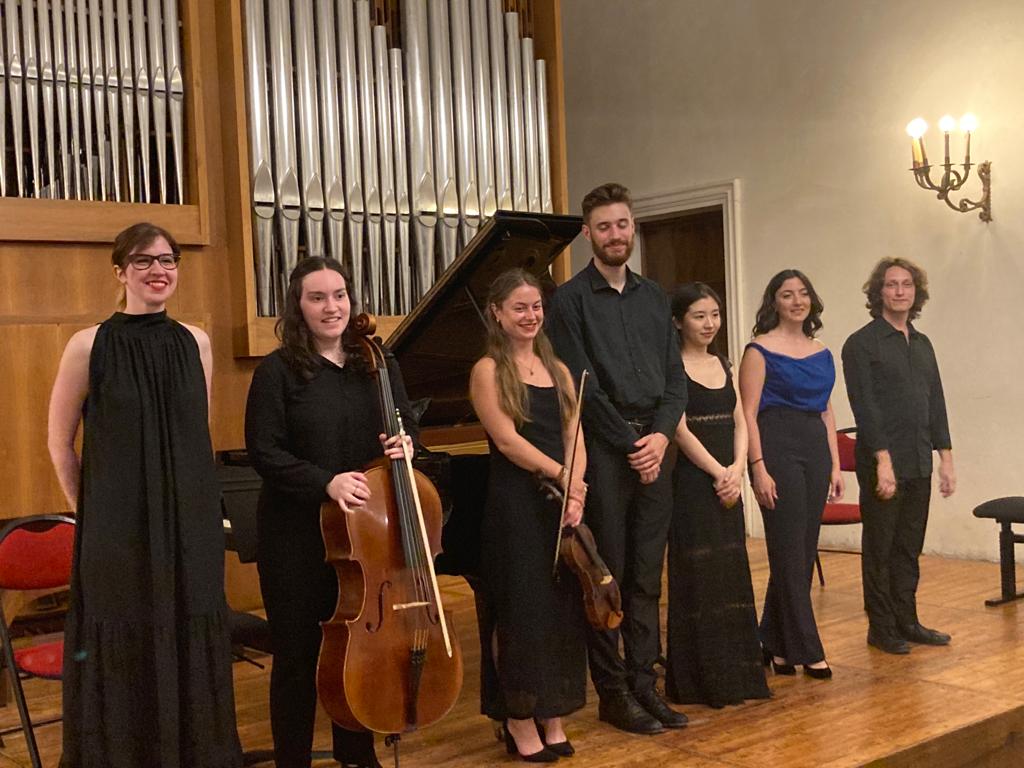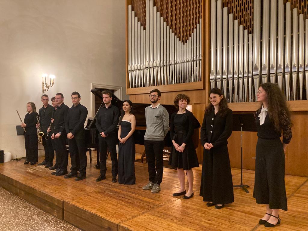 Repertori di raro ascolto hanno caratterizzato i primi tre concerti rodigini dedicati prevalentemente agli strumenti a fiato, mettendo in rilievo la ricchezza di questo dipartimento sia negli ensemble di legni – rappresentati venerdì 5 maggio dal quartetto di clarinetti con Enrico Moretti, Matteo Brusaferro, Sebastiano Ballo Bertin e Nicolò Perlari – sia negli ottoni – col quintetto Leonardo Sandri e Andrea Giovannitti trombe, Elia Donegà corno, Alessandro Fraccascia trombone, Paolo Lenzi basso tuba il 12 maggio – e nei sassofoni – con Marco Brusaferro al soprano, Nicola Cecchetto al contralto, Davide Periotto al tenore e Jacopo Borin al baritono – che hanno dato vita ad una originalissima rilettura di celebri pagine di Carlos Guastavino e Astor Piazzolla nelle efficacissime trascrizioni di David Vicentini, rese con straordinaria sicurezza tecnica e tensione espressiva, il 19 maggio, sia ancora in formazioni con pianoforte, da un lato sempre con i sassofoni di Nicola Cecchetto e Jacopo Borin in impegnative pagine sonatistiche con Marina Miani, Beatrice Bruscagin e He Qing al pianoforte: sempre He Qing è stata inoltre protagonista di una delle più intense pagine cameristiche del Novecento il Sestetto di Francis Poulenc con Camilla Masin flauto, Marta Zese oboe, Enrico Moretti clarinetto, Christian Scalaprice corno e Filippo Tomasi fagotto.