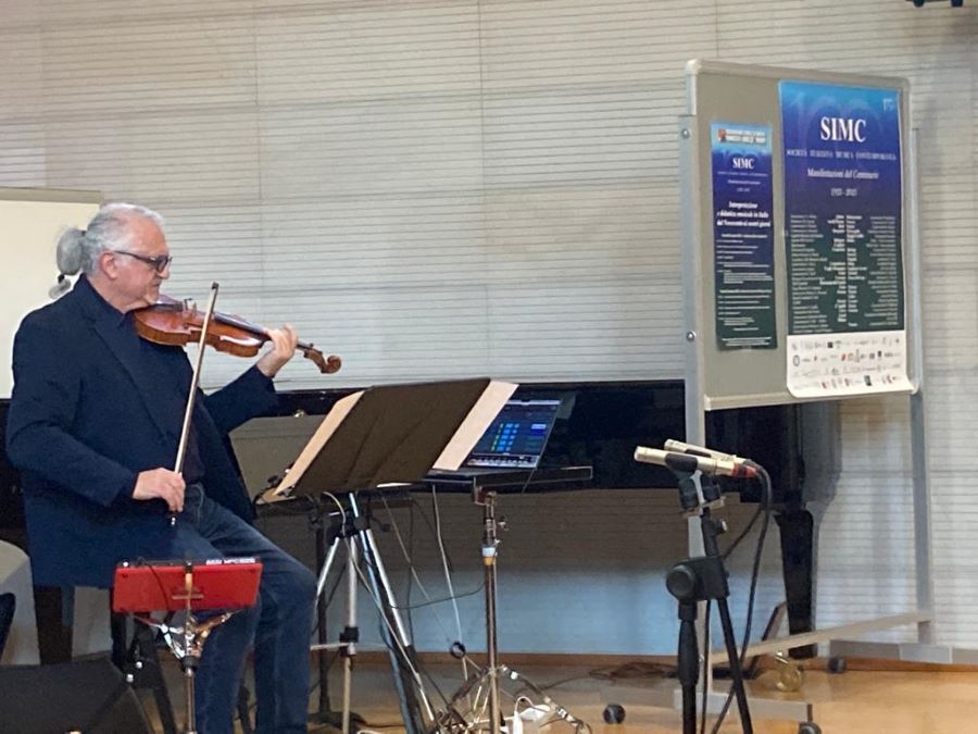 Cesare Frisina, docente di violino, ha invece posto l’accento sugli sviluppi nel secondo dopoguerra della musica concreta ed elettronica culminata nell’ascolto di Cadenza esplosa di Luigi Ceccarelli (presente in collegamento zoom) e nell’esecuzione di Warfield per violino e live electronics dello stesso Frisina.