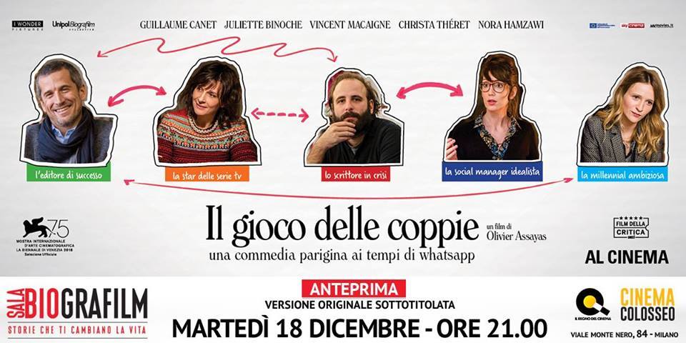 Il gioco delle coppie è un film di genere commedia del 2018, diretto da Olivier Assayas, con Guillaume Canet e Juliette Binoche. Uscita al cinema il 03 gennaio 2019. Durata 108 minuti. Distribuito da I Wonder Pictures.