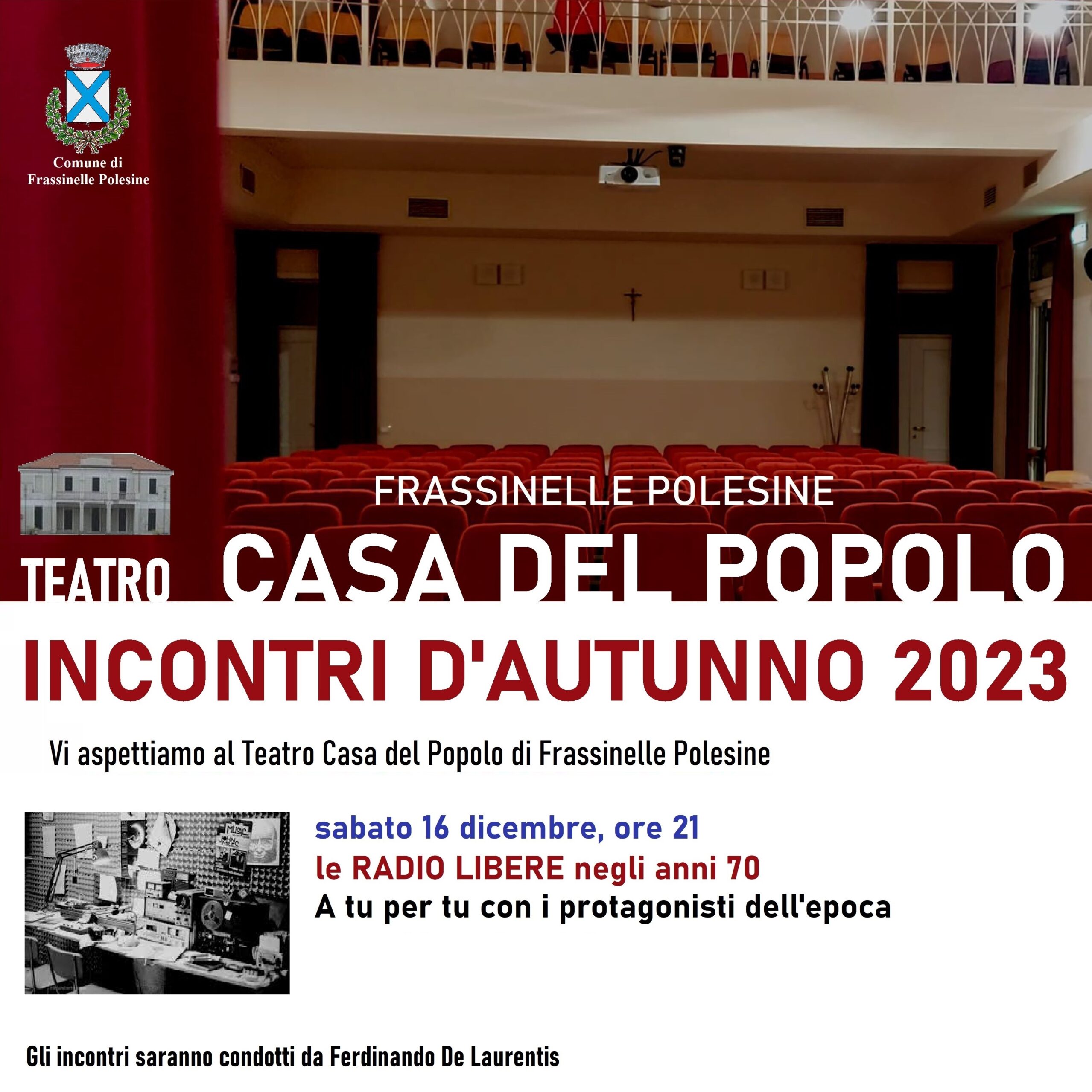 Frassinelle Polesine (RO) – Sabato 16 dicembre, alle ore 21, al Teatro Casa del Popolo si parlerà delle Radio libere polesane degli anni ’70 con alcuni tra i principali protagonisti di un fenomeno, soprattutto giovanile, importante per il nostro territorio.