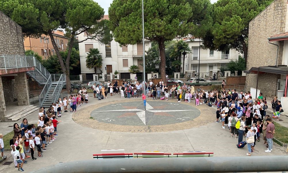 Riuniti intorno alla rosa dei venti che capeggia al centro del cortile, gli alunni di prima hanno vissuto il loro rito di passaggio non senza emozioni: ciascuno di loro aveva una piccola chiave che rappresentava il traguardo raggiunto e la possibilità di aprire una porta immaginaria, quella del loro futuro. Presenti anche le maestre delle diverse Scuole dell’Infanzia che per tre anni hanno accompagnato la crescita di queste donne e questi uomini del futuro.