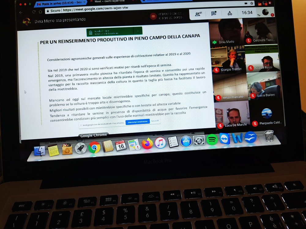 In apertura dell’incontro virtuale hanno portato i saluti Gianni Rossi, in rappresentanza di Coldiretti Rovigo (capofila del progetto), Pierpaolo Caldart per Coldiretti Treviso e Giorgio Trentin, direttore dell’unità operativa Qualità, conoscenze e innovazioni agroalimentari della Regione del Veneto. Successivamente hanno preso la parola, per un approfondimento tecnico e rapporto sullo stato di avanzamento relativo al primo anno di programmazione del lavoro svolto: Dina Merlo, consulente del progetto, relativamente agli aspetti di coltivazione agronomica della coltura; Massimo Montanari per Crea Rovigo (partner del progetto) soprattutto in merito alla valutazione delle varietà presenti nei campi prova. Ha proseguito Lucia Bailoni, docente di nutrizione al dipartimento di Biomedicina comparata e alimentazione dell’Università di Padova (partner del progetto), commentando i dati scaturiti dalle analisi qualitative e produttive eseguite dall’ateneo patavino, per quanto riguarda la sperimentazione nell’alimentazione dei vitelli a carne bianca di alcuni derivati alimentari della canapa. Infine sono intervenuti altri partner del progetto: Alberto Bertin di Coldiretti Veneto che ha riepilogato le specifiche normative in materia, e aspetti legali della coltivazione, e in chiusura dell’evento ed Elio Tronchin di Impresa Verde Treviso e Belluno.
