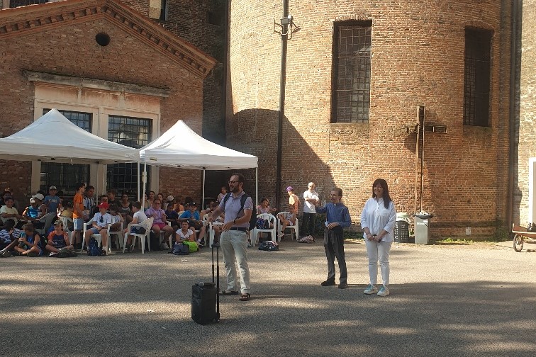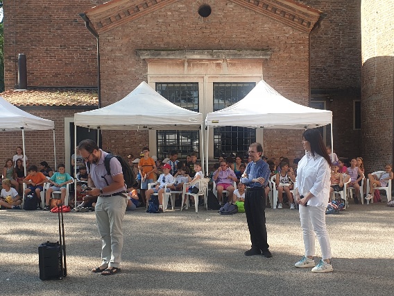 ROVIGO – Ambiente più pulito, meno costruzioni, aiutare le persone povere, riparare le buche, più percorsi per le bici, più alberi e che Rovigo sia città di pace. Sono alcune delle richieste che i bambini dell’animazione estiva della parrocchia di San Bortolo, hanno rivolto direttamente al sindaco Valeria Cittadin che questa mattina ha portato un saluto. Ad accoglierla don Andrea Varliero e don Christian Malanchin che hanno presentato il primo cittadino ai numerosi partecipanti del grest estivo.