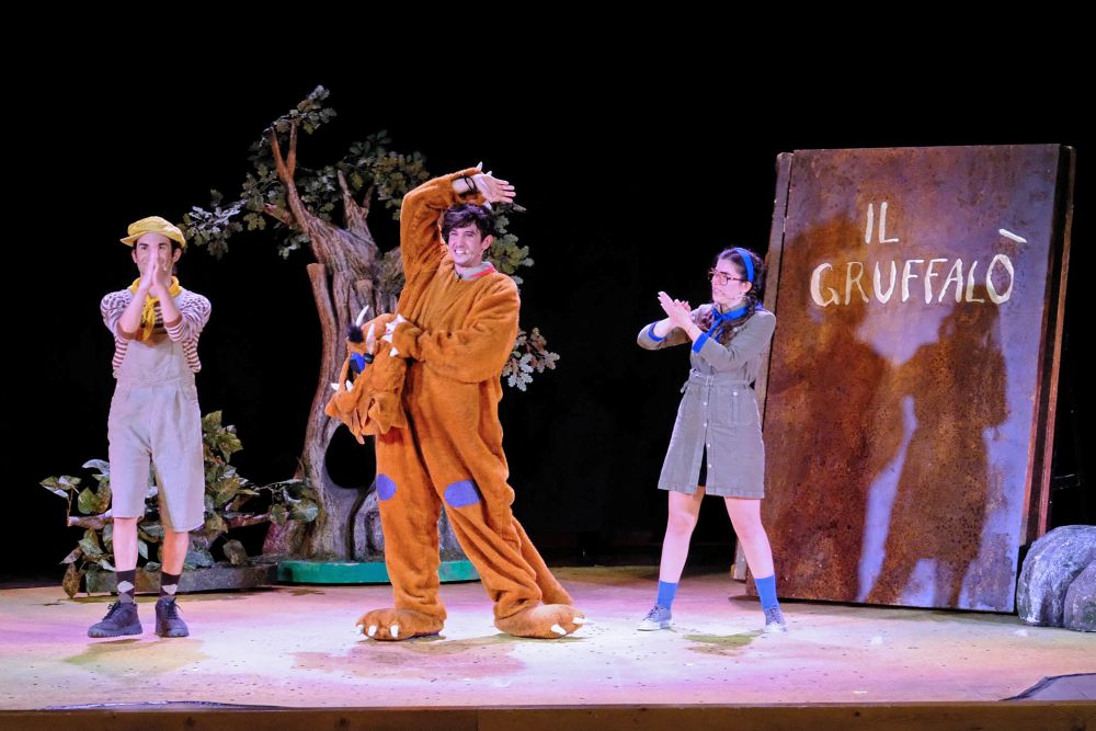 Strepitosi i tre attori protagonisti: Matteo Erli (il Gruffalò), Bianca Ferrarini al suo debutto in questa produzione (Volpe, Civetta, Serpente) ed Ivan Portale (il topolino). Cantano, interpretano in rima, ballano e si muovono riempiendo lo spazio scenico e sprizzando energia a tutti i livelli. Infatti, diventa intenso e palpabile lo scambio emotivo col pubblico che applaude, gioisce, suggerisce e partecipa alla “storia boscosa paurosa”.