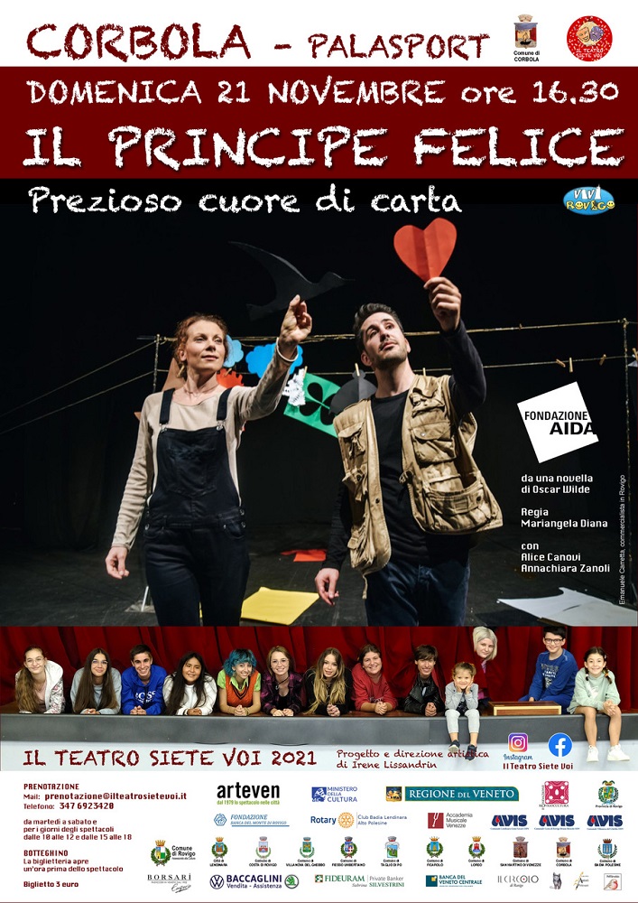 Sarà in scena al Palasport di Corbola, domenica 21 novembre 2021, alle 16.30, “Il principe felice. Il prezioso cuore di carta”, trasposizione dell’omonima fiaba, per il teatro d’attore per ragazzi, della compagnia Fondazione Aida di Verona. Il pubblico ideale va dai 5 ai 10 anni, ma lo spettacolo è fruibilissimo da chiunque. Ingresso tre euro per tutti, con prenotazione obbligatoria, scrivendo a: prenotazione@ilteatrosietevoi.it; o via telefono al 347/6923420. Green pass sopra i 12 anni.