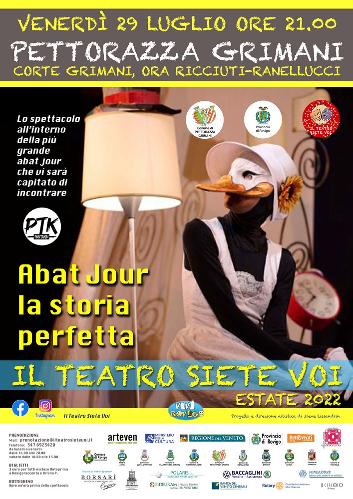 Pettorazza Grimani (RO) – Straordinario evento di teatro commisto a circo e suggestioni oniriche, adatto a tutte le età, in prima assoluta per il Polesine. “Abat-jour la storia perfetta”, è il titolo dello spettacolo originale della veneziana compagnia Pantakin teatro, in un nuovo allestimento, programmato per “Il teatro siete voi-estate 2022”, che arriva, per la prima volta a Pettorazza Grimani. Appuntamento imperdibile, dunque, venerdì 29 luglio, alle 21, a Corte Grimani Ricciuti Ranellucci, a Pettorazza.